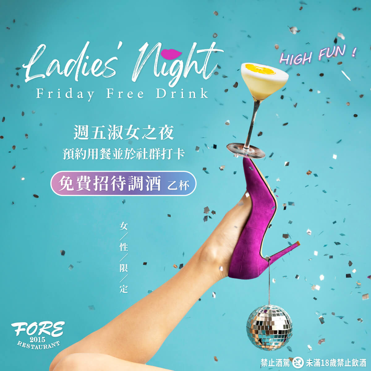 每週五晚上凡年齡18歲(含)女性,於IG或FB打卡分享活動,就招待調酒乙杯。