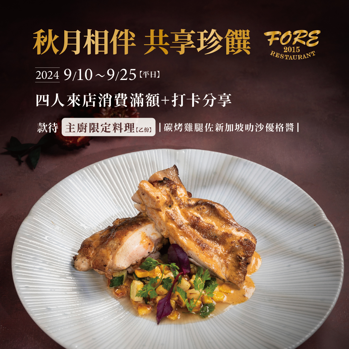 中秋佳節🌕與親朋好友共享珍饌時光💕 9/10(二)-9/25(三) 平日來店用餐(限週一至週五) 四人同行消費滿$8,800(不含服務費)並於FB/IG上打卡 即招待主廚限定料理🌿「碳烤雞腿佐新加坡叻沙優格醬」乙份 ※此活動限定內用,且恕無法與門市現有折扣活動合併使用 ※門市保有修改、異動與活動最終解釋權